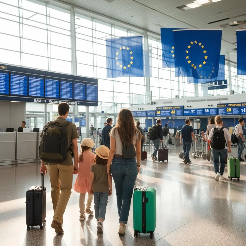 [image_prompt1]Wide shot of a modern European airport border control area with self-service kiosks, travellers standing in line, bright neutral lighting, no visible logos or text[/image_prompt1]