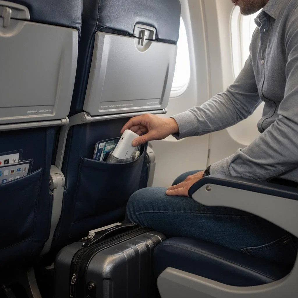 - Powerbank ma być w miejscu, które da się monitorować: kieszeń fotela, przy sobie albo w bagażu pod fotelem.